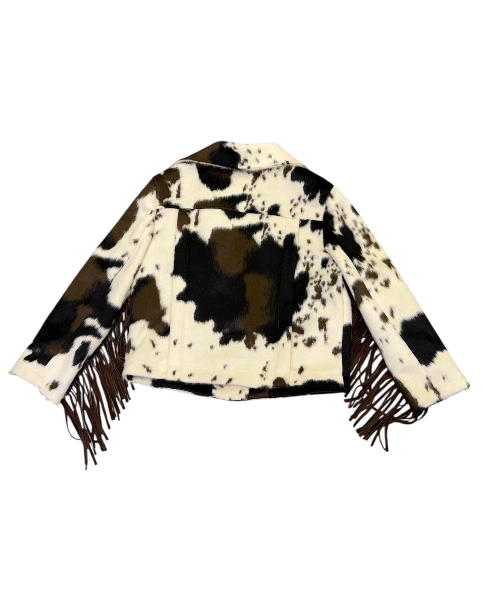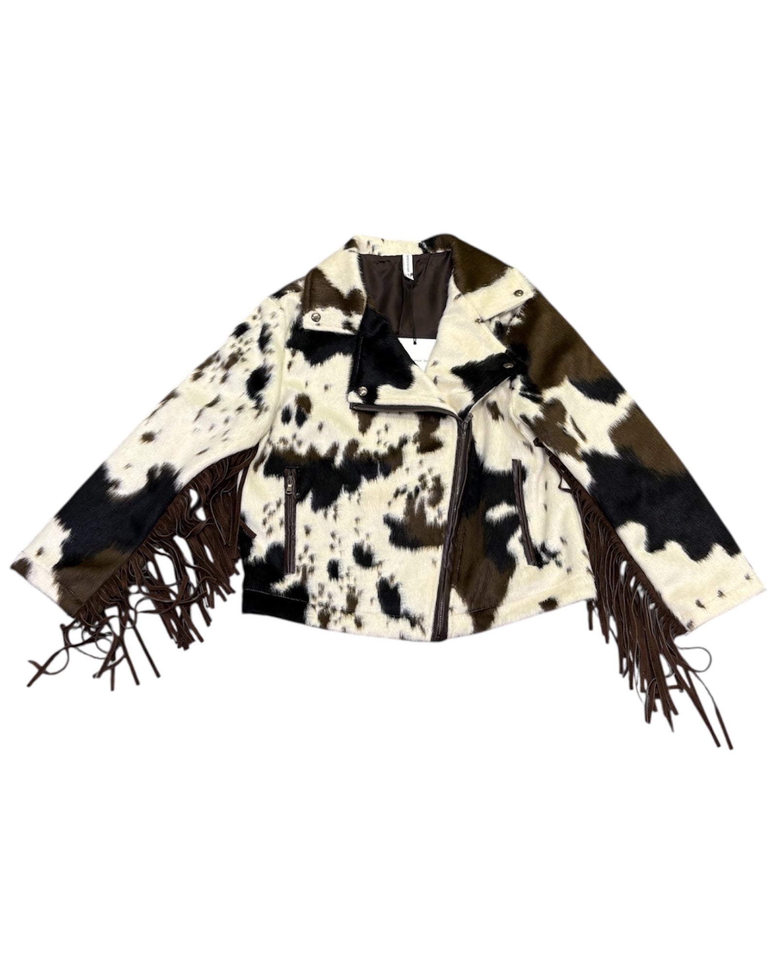 Giacca in eco-pelliccia effetto cavallino con fantasia maculata nei toni del bianco, nero e marrone. Modello crop dalla vestibilità corta, impreziosito da frange laterali che donano un tocco grintoso e originale. Chiusura frontale con zip e dettagli biker.