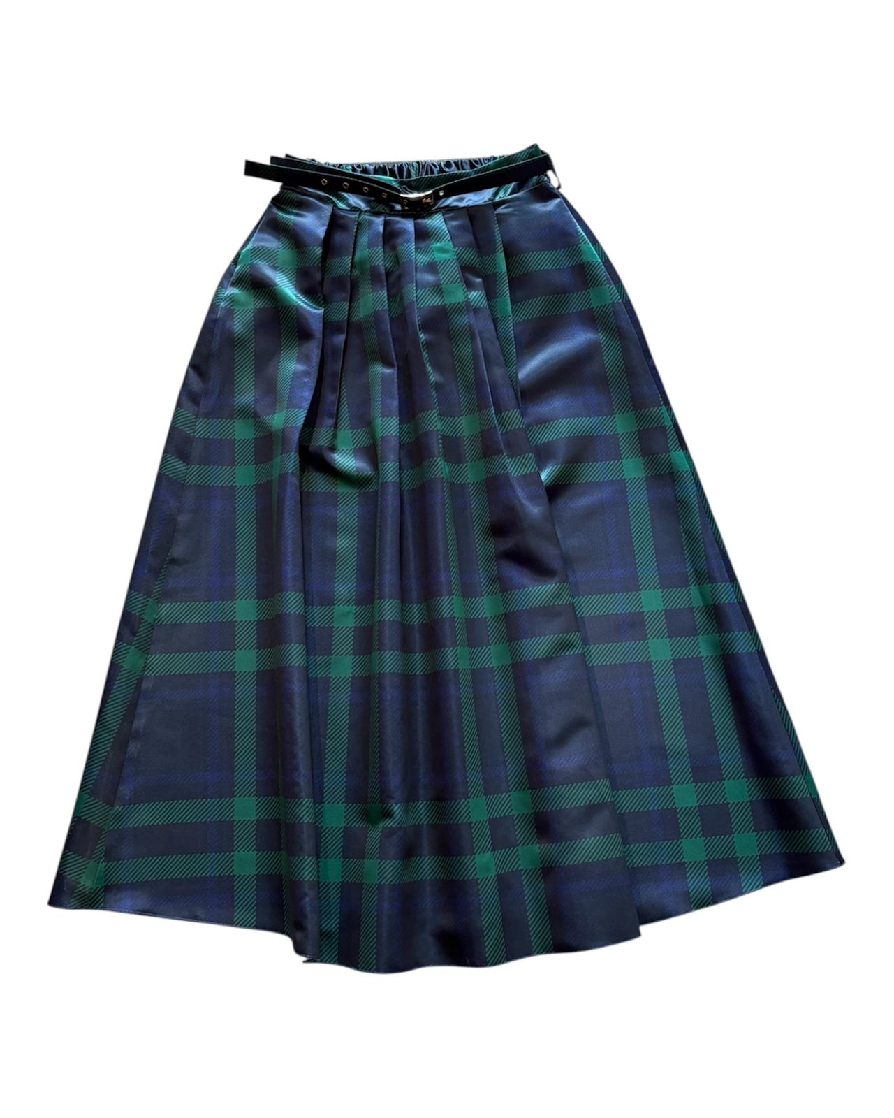 Gonnellone a fantasia scozzese, in tessuto seta, con pieghe al cinto, chiusura con molla al cinto e cinturino incluso.