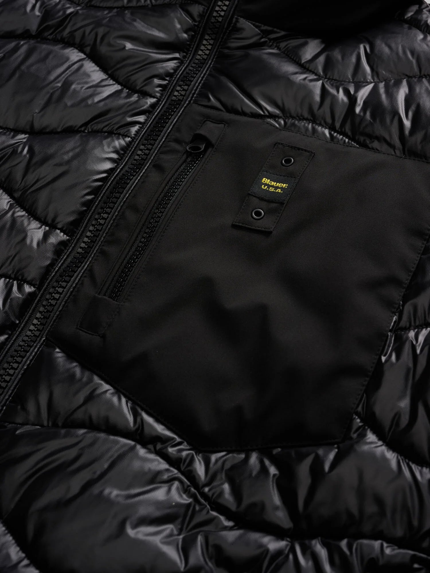 Piumino monocromatico in neoprene leggero e liscio sulle maniche e in nylon lucido impunturato ad onde sul corpo. Imbottitura mista per avere caldo anche in condizioni meteo avverse.