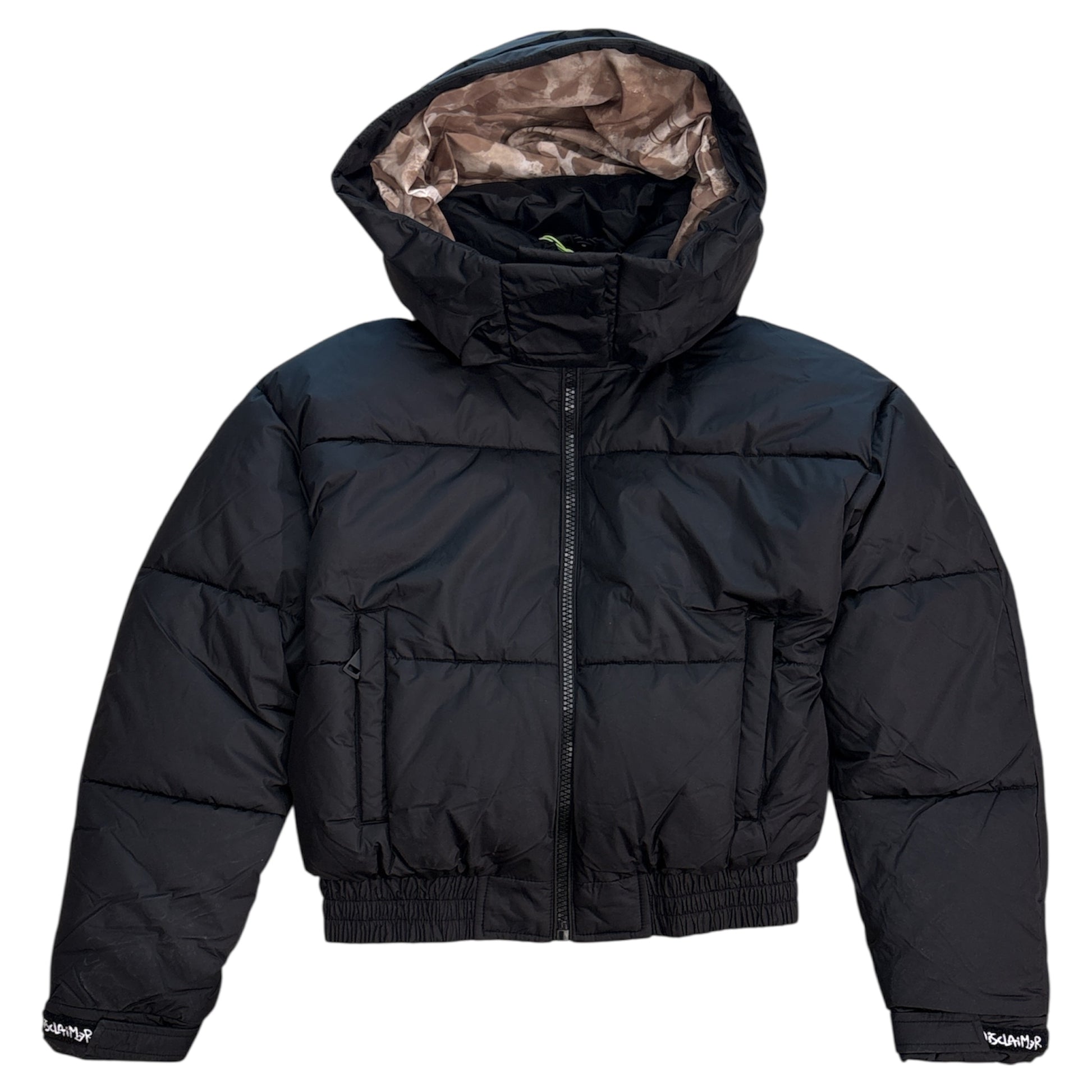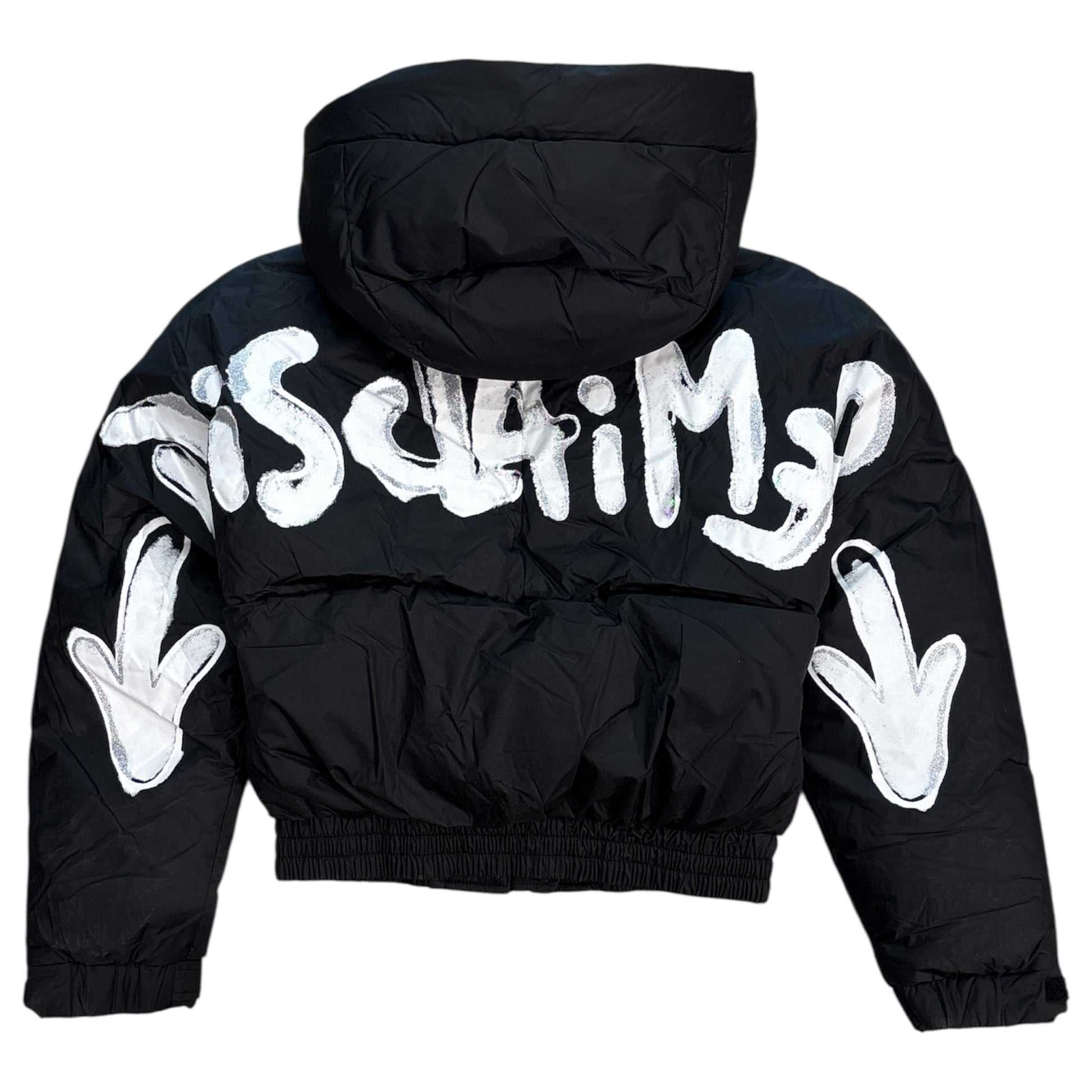 Piumino con stampa posteriore, cappuccio fisso, collo alto con logo in 3D, maniche lunghe con polsino regolabile, tasche laterali e chiusura frontale a doppio cursore