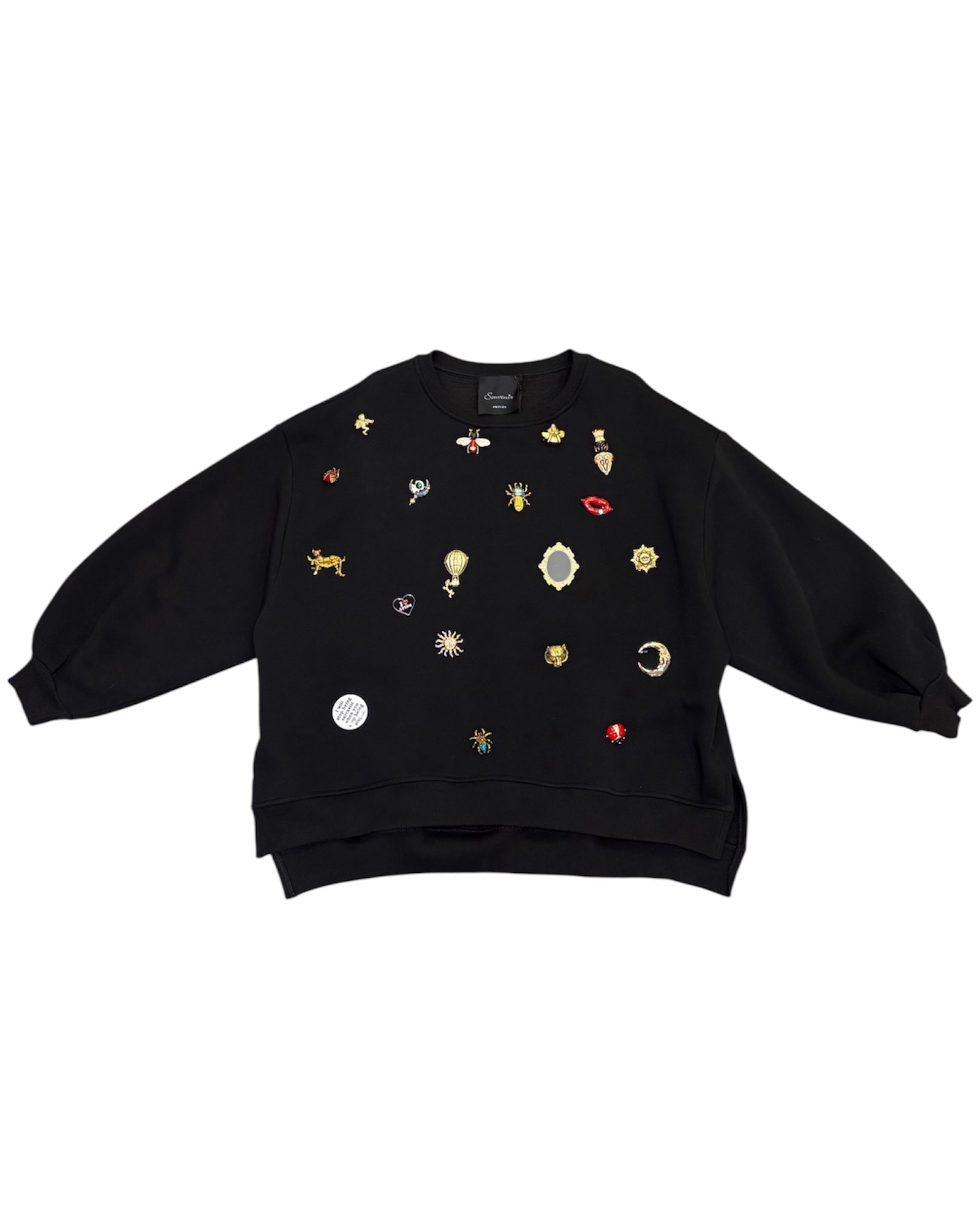 Felpa oversize in cotone nero, caratterizzata da applicazioni ricamate e patch colorate sul davanti che creano un design unico e d’impatto. Girocollo, maniche ampie e fondo regolare per una vestibilità comoda e trendy.